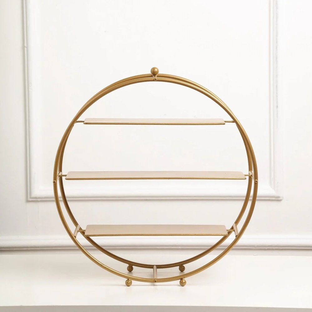 This elegant 3-tier cupcake stand features a stunning golden metal finish with sturdy iron and MDF sheet construction. Measuring 22" in width and height, it provides a stylish and functional display for cupcakes, desserts, or snacks, perfect for parties, celebrations, or any special occasion.
