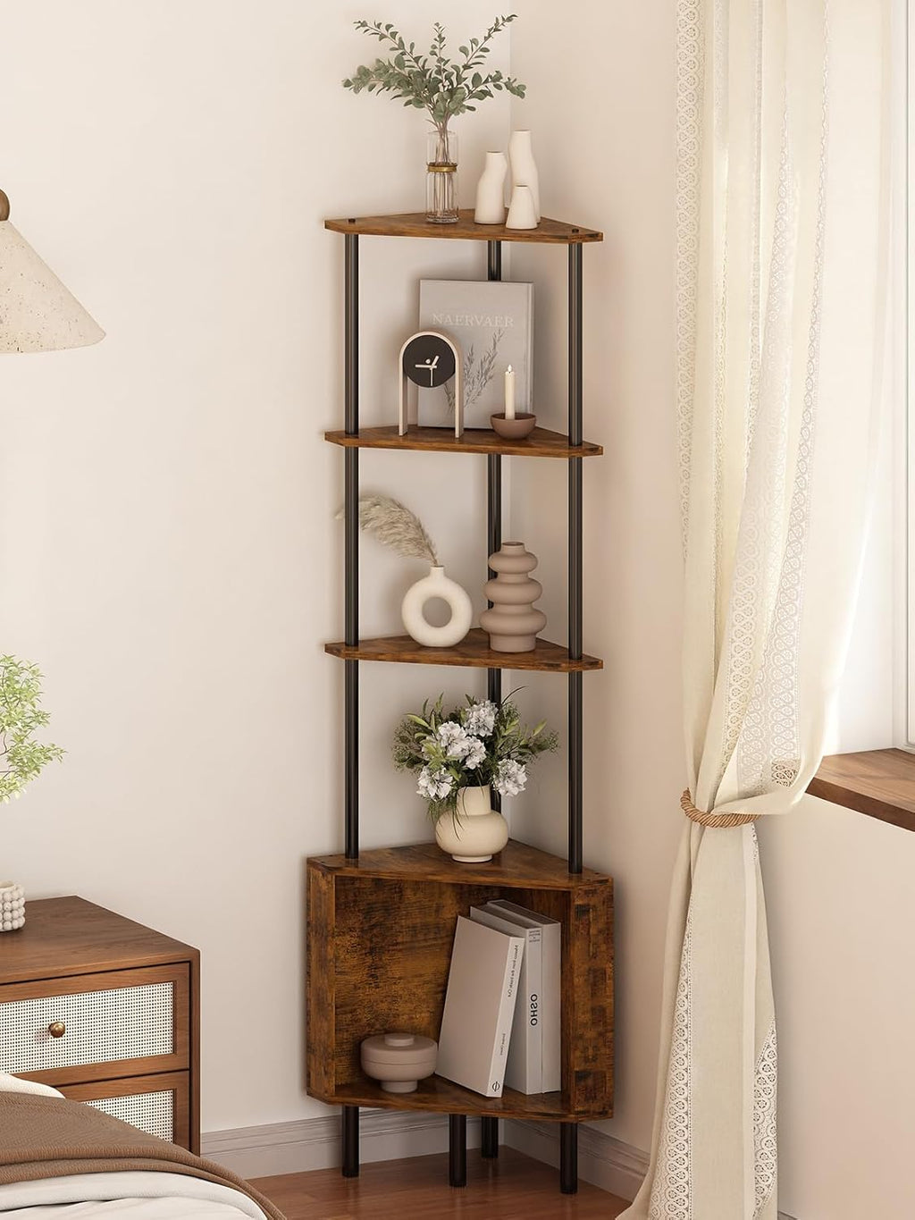 Maximize your space with the GILLAS 5-Tier Corner Shelf Stand – a 55" tall industrial bookshelf perfect for displaying plants, books, or décor. Ideal for living rooms, bedrooms, or home offices. Sturdy, stylish, and space-saving.