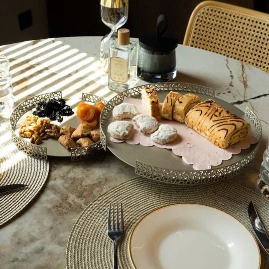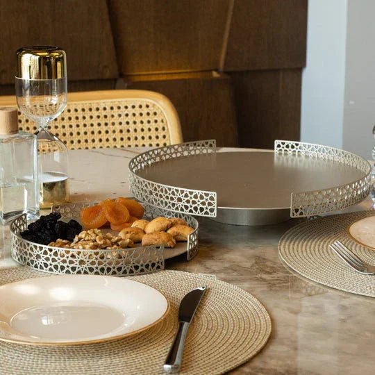 Enhance your ambiance with our high-quality metal presentation stand featuring Islamic motifs. Its chic and modern design adds elegance and tranquility to any table decor. Perfect for those seeking both beauty and serenity, our elegant stand is an ideal choice. Beautify your living space with this unique piece.