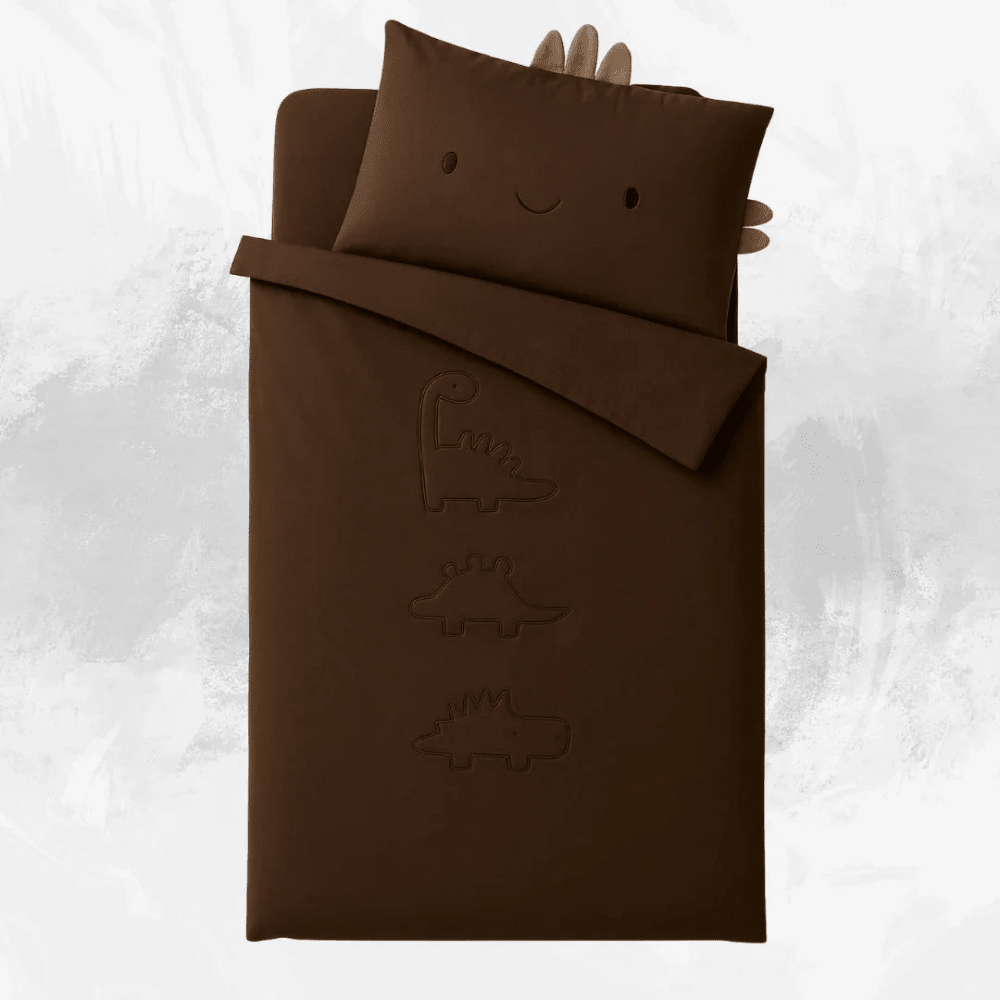 Add a playful touch of charm to your child’s bedroom with this dinosaur-themed bedding set. Featuring a soft duvet cover with adorable embroidered dinosaur outlines and a pillow with a cheerful smiling face, this set combines comfort and fun in one. The high-quality fabric ensures a cozy night’s sleep, while the whimsical design makes it a delightful addition to any nursery or kids’ room. Perfect for little dino lovers, this bedding set brings imagination and comfort together beautifully.