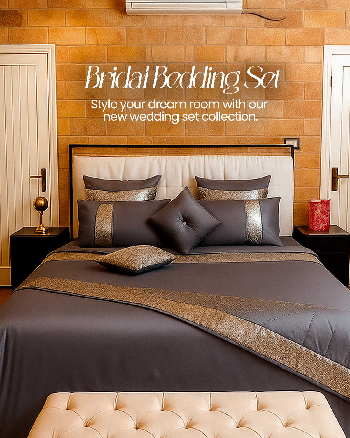 The luxury may come from the materials used, such as high-thread-count cotton or silk, or from the design and embellishments, such as embroidery or beading. The grey color may be a neutral and sophisticated choice for a bridal bedroom.