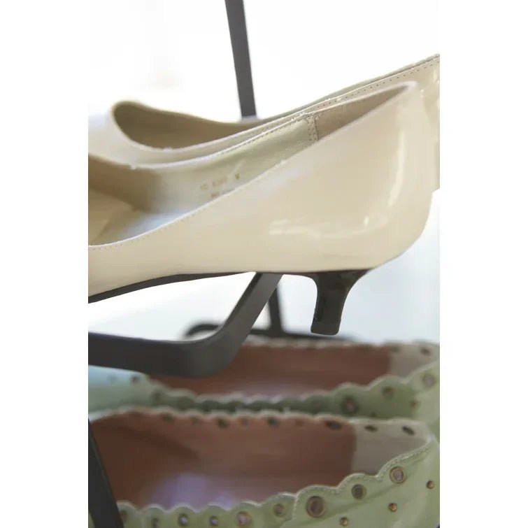 This stylish shoe rack fits also into smaller entryways and is perfect for organizing shoes without using too much space. The handle makes it especially ease to pick up and move around.